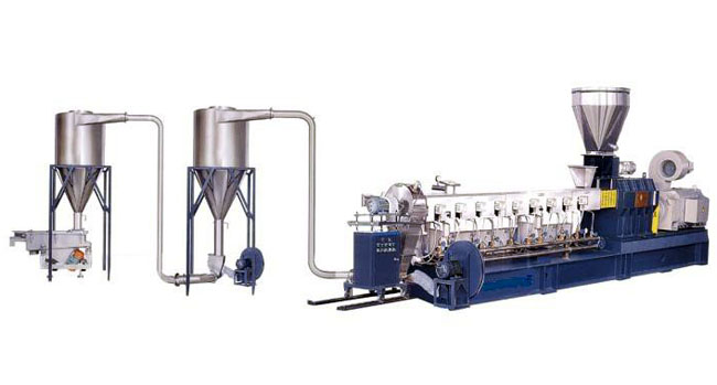 木塑造粒系統(tǒng)由雙螺桿擠出機、熱切造粒機、三級風等幾部分送組成。